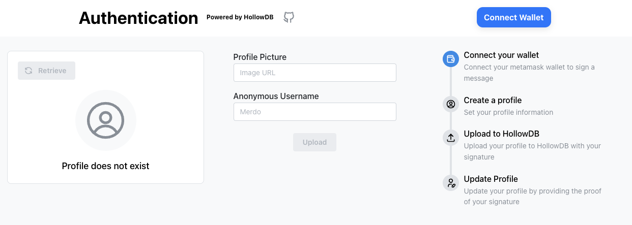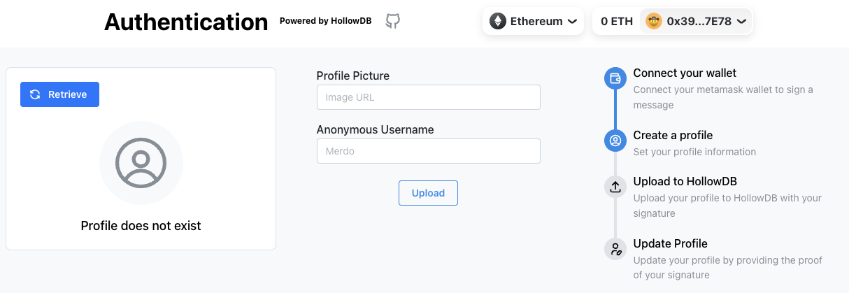 This demo is intended to demonstrate the power of ZK-proofs in HollowDB by storing a profile on HollowDB contracts without revealing any information about yourself.