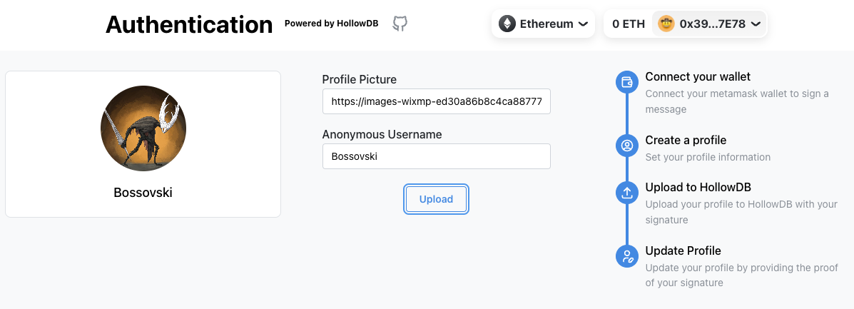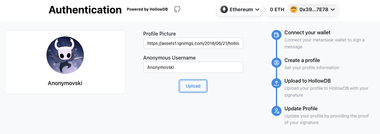 Anonymous authentication is another demo app developed using HollowDB, users can create profiles while keeping their identity anonymous and the only way to update the profile is to provide a zero-knowledge proof.\